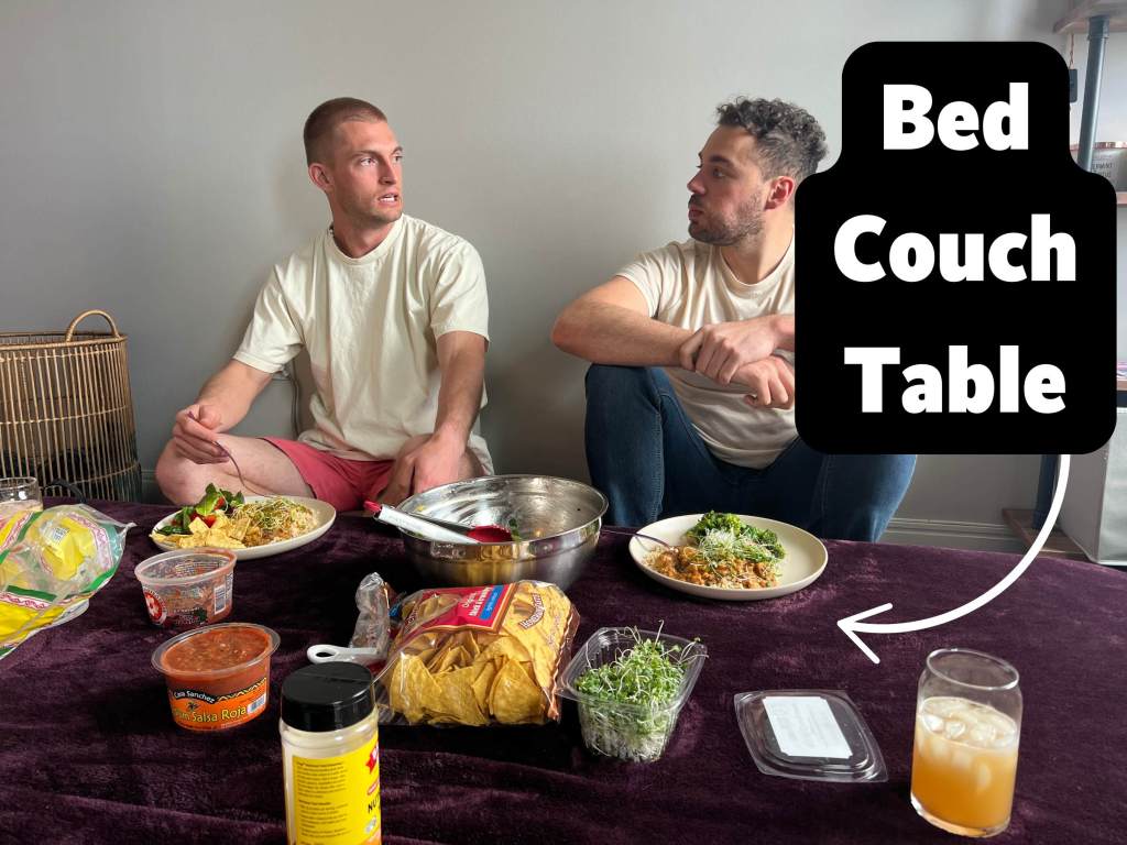 I cooked lunch and spread it across the couch/bed/table I owned. It was literally all three in one.