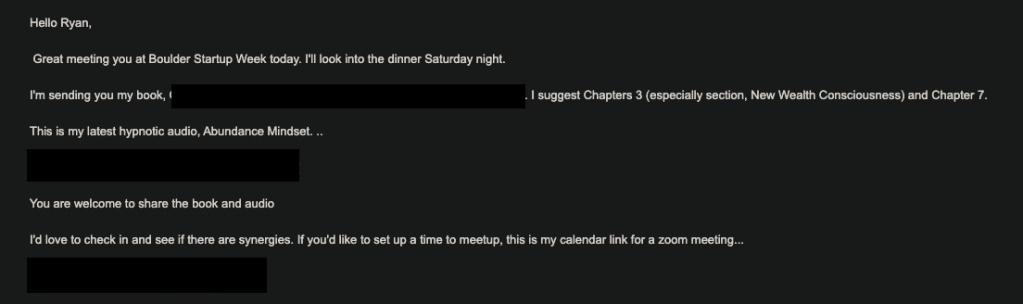 The reason I say that is because professional “networkers” are incredible at follow up. Check out this email I got the day after meeting a man at a start-up week event.